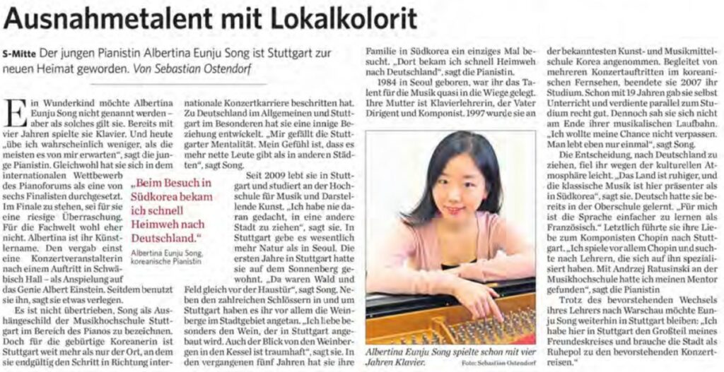 Die Pianistin Albertina Eunju Song konnte bereits mit zahlreichen internationalen Auftritten auf sich aufmerksam machen. Genannt seien z.B. solistische Auftritte mit den Solisten der Staatskapelle Dresden, im Bukarester Athaeneum in Rumänien, mit dem Leipziger Streichquartett, in der Liederhalle Stuttgart, in der Alten Oper Frankfurt, auf dem Piano Festival Rom, bei der Mozart Gesellschaft Stuttgart sowie Übertragungen im südkoreanischen Fernsehen „ARTE“. Sie wurde in Seoul, Südkorea, geboren und wuchs in einer Musikerfamilie auf. Ihre pianistische Ausbildung begann sie in Südkorea und setzte ihr Studium an der Staatlichen Hochschule für Musik und Darstellende Kunst Stuttgart fort. Hier schloss sie ihren Master und das Konzertexamen im Fach Klavier mit Auszeichnung ab. Sie erhielt wichtige künstlerische Impulse bei Karl-Heinz Kämmerling, Bernd Götzke, Pavel Gililov, Andrzej Jasinski und Jura Margulis. Albertina Eunju Song ist erste Preisträgerin zahlreicher internationaler Wettbewerbe. Unter anderem gewann sie 2011 den 1. Preis beim Musikpreis des Lions Club Stuttgart-Schlossgarten und 2014 den Publikumspreis des Internationalen Deutschen Pianistenpreises in Frankfurt. Im November 2019 führte Sie als Gewinnerin des Int. Klavierwettbewerbs „Humberto Quagliata“ Bachs Klavierkonzert in d-Moll mit dem Orchester di Arrezzo auf. Seit Mai 2019 hat sie einen Lehrauftrag für Klavier an der SMTT inne.